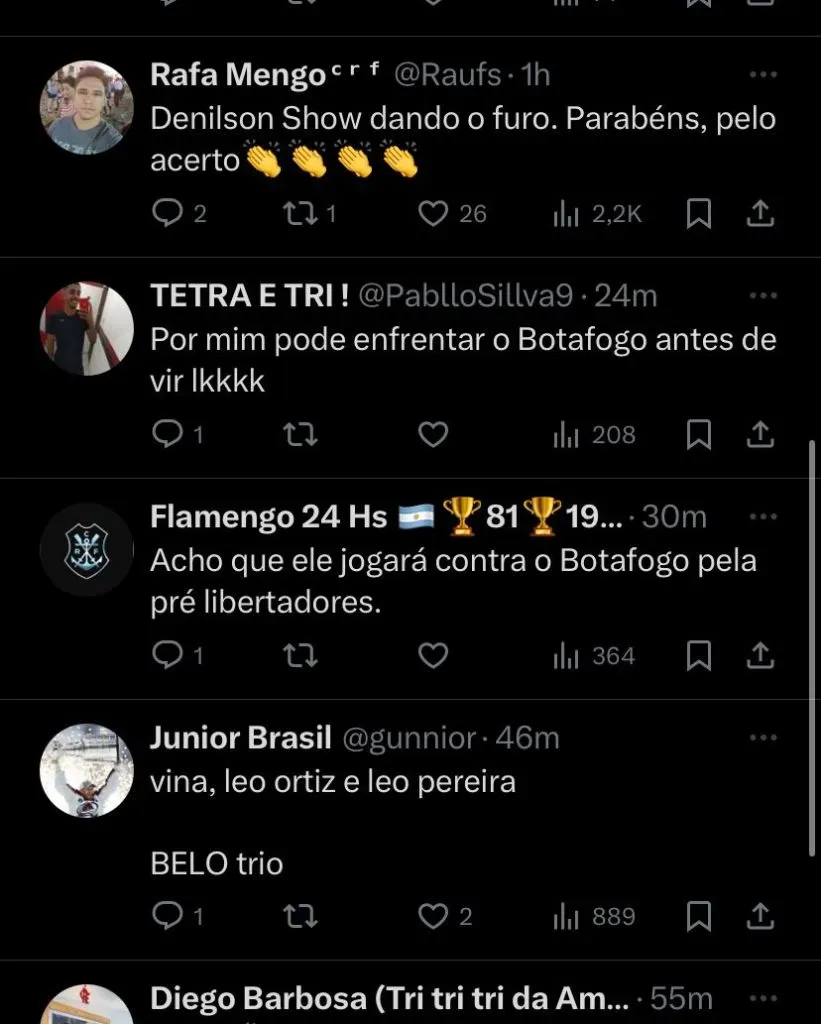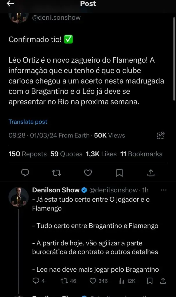 Em publicação no X (antigo Twitter), o ex-jogador afirmou que tudo foi acertado nesta madrugada: (SIC) “Confirmado tio! Léo Ortiz é o novo zagueiro do Flamengo! A informação que eu tenho é que o clube carioca chegou a um acerto nesta madrugada com o Bragantino e o Léo já deve se apresentar no Rio na próxima semana”, publicou.