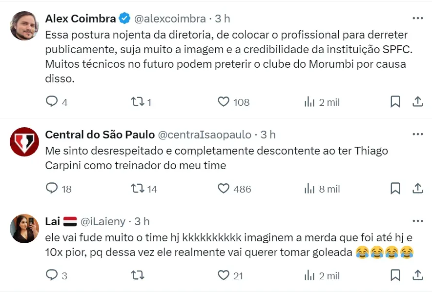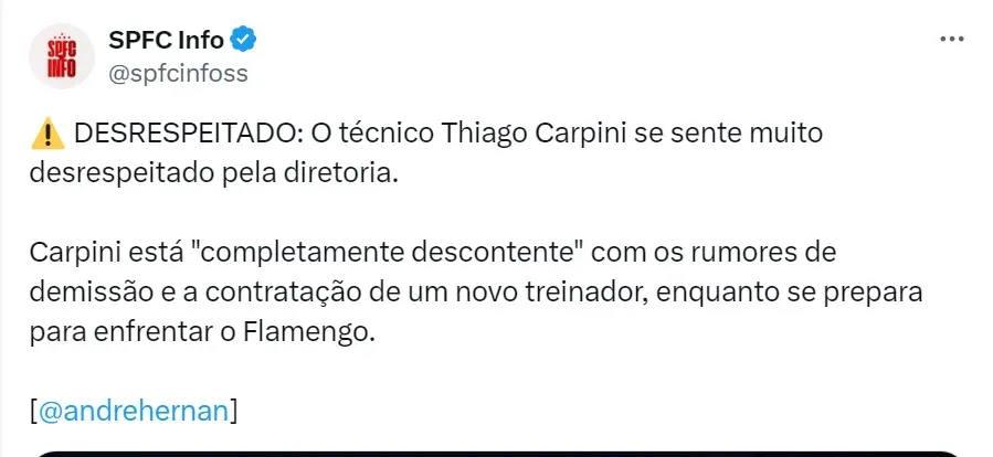 Carlos Belmonte, dirigente do São Paulo, disse que Thiago Carpini é o treinador do Tricolor Paulista. Porém, nos bastidores do Clube Paulista, o discurso é que a saída do técnico deve acontecer após o jogo de hoje.
