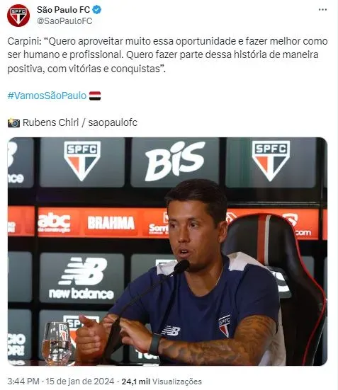 Contudo, Carpini iniciou deixando claro que está por dentro de como o São Paulo administra seu plantel: “Desde o primeiro bate-papo com a diretoria, que espero que se repita em outros clubes, para se ter mais critérios, eu sei muito bem todos os jogadores. Os que estão participando da base, os que saíram, os que jogaram mais, os que jogaram menos”.