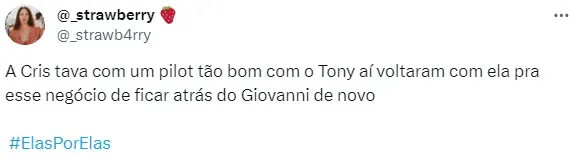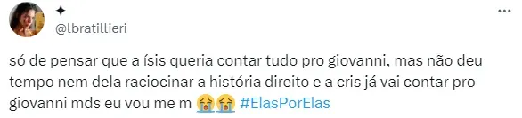 Em Elas por Elas, Cris (Valentina Herszage) ainda segue em seu plano de destruir o relacionamento de Ísis (Rayssa Bratillieri) e Giovanni (Filipe Bragança), por quem sempre foi apaixonada.
