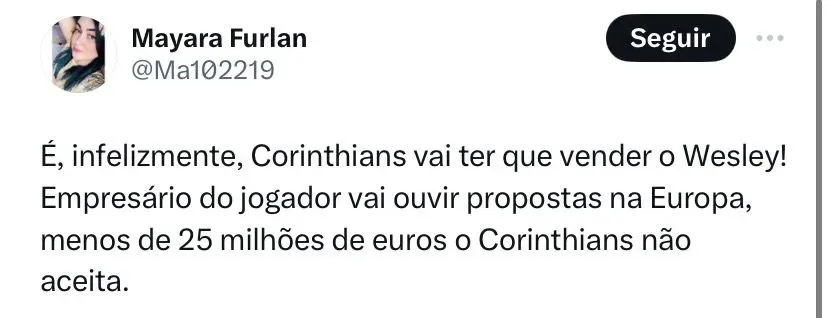 O Corinthians possui 70% dos direitos econômicos de Wesley, que possui contrato até agosto de 2027. A multa rescisória está avaliada em 100 milhões de euros, mas o Corinthians entende que não será possível negociar por essa cifra no momento.