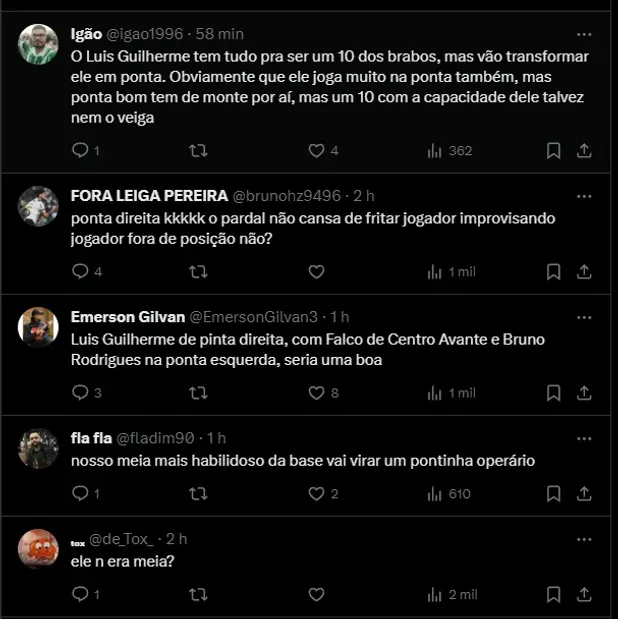 O jogador também está sendo escalado na ponta-direita, pelo lado do campo. Na temporada passada, Luis Guilherme já atuou nessa posição, mas foi mais escalado no meio de campo.