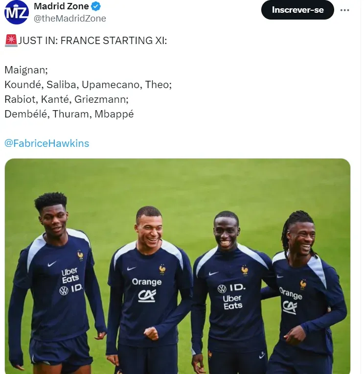 Escalação da França: o possível time francês que deverá entrar em campo contará com a presença de Maignan; Koundé, Saliba, Upamecano e Theo; Rabiot, Kanté e Griezmann; Dembélé, Thuram e Mbappé. O zagueiro do Liverpool, Konaté, perdeu a disputa com Saliba, do Arsenal.