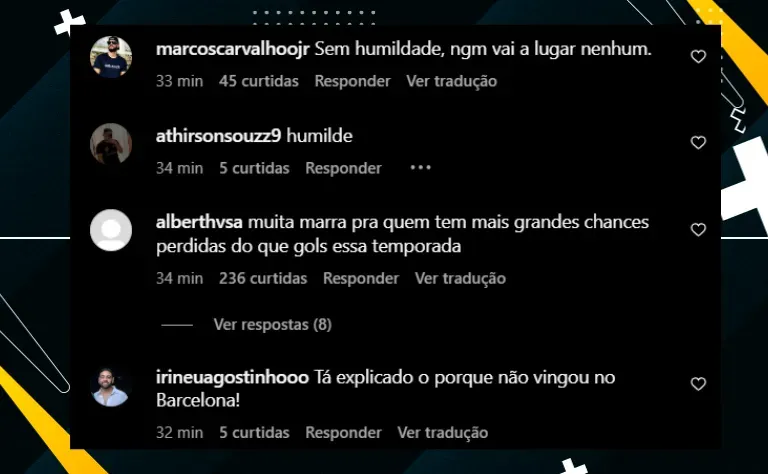 “Muita marra para quem tem mais grandes chances perdidas do que gols marcados essa temporada”, aponta outro torcedor. “Tá explicado porque não deu certo no Barcelona“, completa outro.