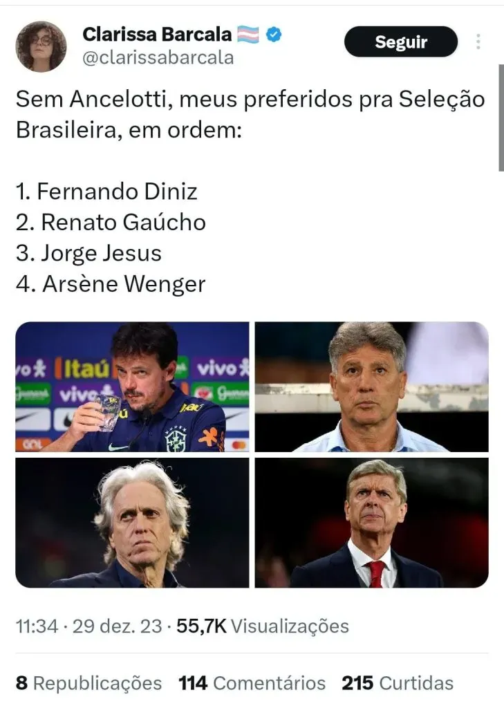 A informação abriu uma série de críticas à CBF, que já vinha sendo alvo desde que Tite deixou o comando da Seleção. Meses se passaram antes que a entidade máxima do futebol brasileiro anunciasse Diniz como interino e garantisse Carlo Ancelotti como o comandante da equipe a partir de julho de 2024.