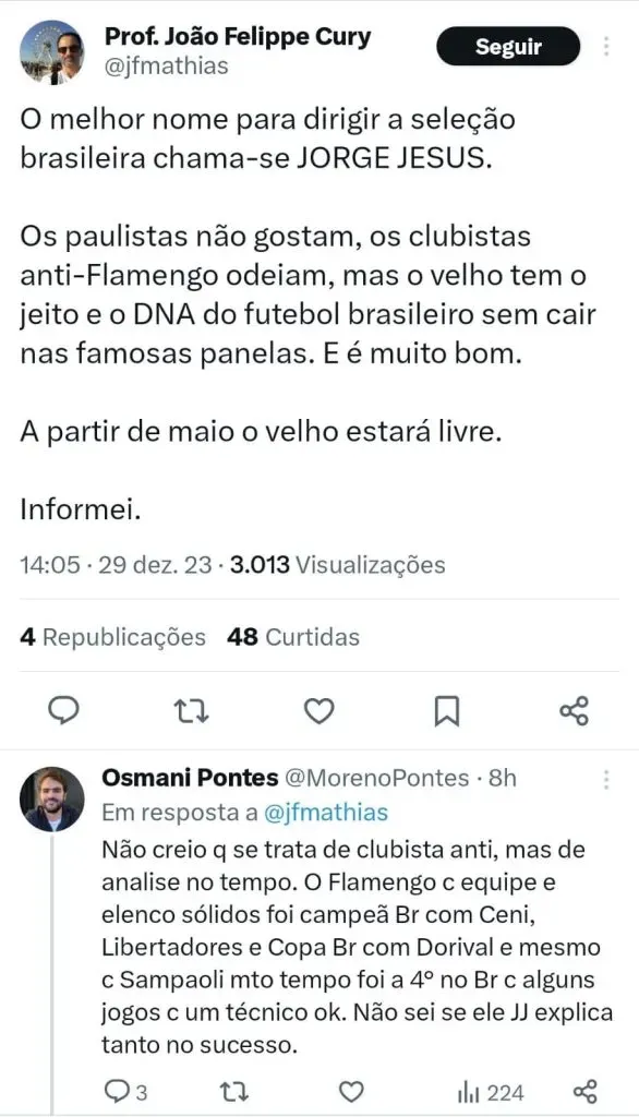 “Só não o técnico da seleção porque Landim (Rodolfo – presidente do Flamengo) fez a caveira dele com Ednaldo”, revelou o jornalista demonstrando a interferência do dirigente do Flamengo na tomada de decisão da CBF.