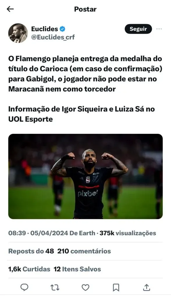 Ou seja, Gabriel Barbosa acompanhará a partida de casa mesmo, já que está proibido de frequentar qualquer coisa ligada ao esporte. Além disso, nesta sexta-feira (5), foi revelada a nova rotina do jogador flamenguista perante a essa polêmica.