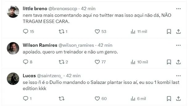 Salazar informou que Cuca também está na pauta do Corinthians. O treinador também é um nome na mira da diretoria, já que a Justiça da Suíça anulou a condenação por estupro.