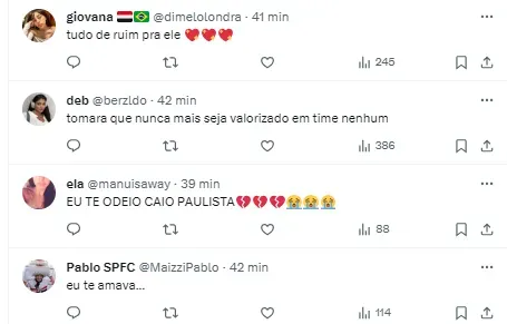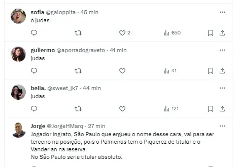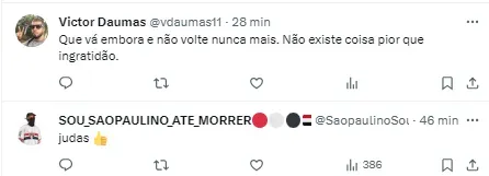 “Judas“, “Eu falo que nossa lateral é zicada, quando acertamos algo, o cara sai pra um rival direto“, “Triste porque eu gostava muito dele, mas se f* também hein, acreditamos nele o ano inteiro, apoiando e os ca* e no final acontece isso“, “Judas do ca*”, “Tudo bem, cara jogou muito, honrou o manto e que seja feliz.”, “Sem vergonha desse“