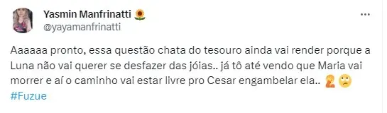 Em Fuzuê, a vida de Maria Navalha pode estar em perigo após a aparição de César Montebello. Sabendo que ele ainda mexe com os sentimentos da cantora, o empresário vai se aproximar da mulher.