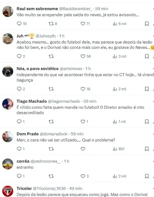 Após a foto publicada, alguns torcedores do São Paulo lamentaram nas redes sociais: “Acabou mesmo… gosto do futebol dele, mas parece que depois da lesão não foi bem, e o Dorival não conta mais com ele, eu gostava do Neves”, escreveu um torcedor no X, antigo Twitter.