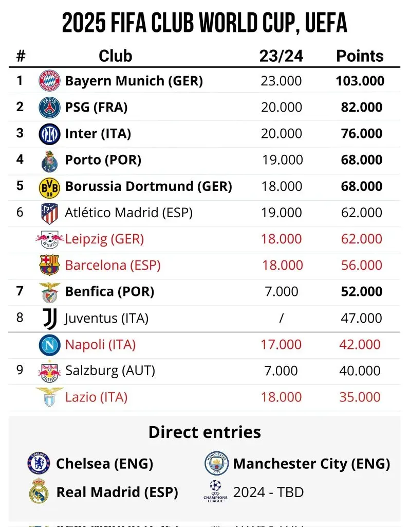 Eles se juntaram ao Bayern de Munique, que é um dos melhores ranqueados, e que também já tinha vaga garantido para a disputa. Outros europeus ainda estão a ser decididos.