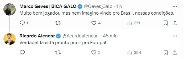 Isso porque, de acordo com Ricardo Alencar, o Atlético Mineiro também demonstra interesse em contar com o futebol do ponta, mas os valores assustam a diretoria.