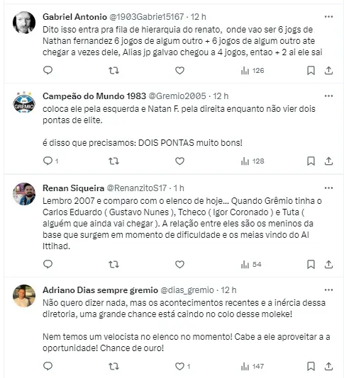 Na sequência, o agente de Gustavo Nunes rebateu e lamentou as declarações do comandante. Além disso, quem também tratou do assunto publicamente foi Brum, que apontou a possibilidade do salário do atacante chegar a R$ 100 mil ao longo de 2024.