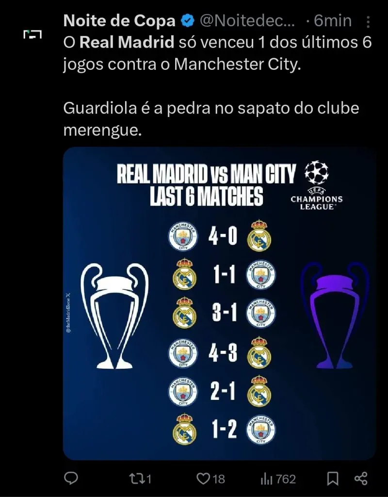 É o terceiro confronto consecutivo entre Manchester City e Real Madrid na Liga dos Campeões. Nos dois anteriores, quem se classificou conseguiu sagrar-se campeão da competição organizada pela UEFA.