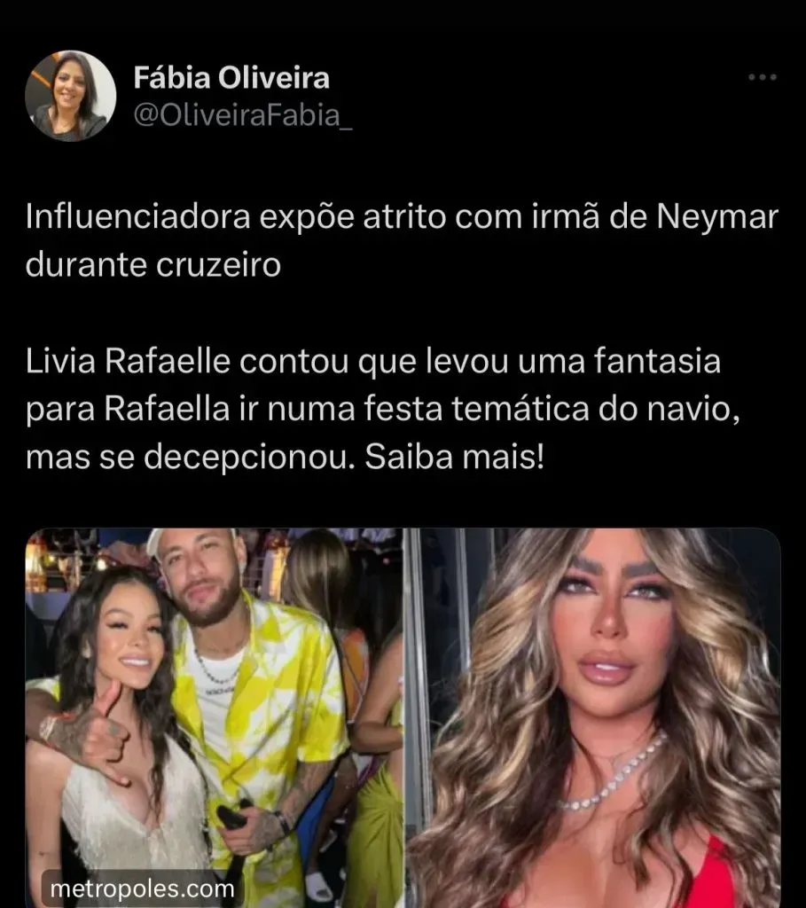“Não vou apagar meu último post!“, escreveu ela. A situação deselegante ocorreu ainda no cruzeiro do Neymar. De acordo com Livia, Rafaella Santos, pediu uma fantasia dela emprestada e não agradeceu.