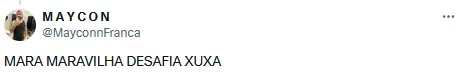 “Vou sempre continuar sendo a Mara Maravilha! Esses showzinhos horrendos que ela tenta fazer comigo usando coadjuvantes, não se compara com a desumanidade que ela, a Xuxa, faz com as verdadeiras causas que beneficiam a sociedade e em especial a proteção e aos direitos das crianças. Isso mesmo que estou afirmando!”, disparou a apresentadora.