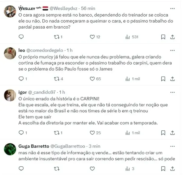 Na última partida, James entrou somente nos minutos finais, não conseguindo ter bom rendimento, bem como o restante do time. Nesse sentido, o presidente Julio Casares falou sobre uma possível titularidade do meia.