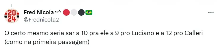Em 2024 o jogador usará a camisa de número 55. Já que Luciano é o dono da 10, o meio-campista – acostumado a ser o 10 por onde passa – quer unir os algarismos (5 + 5 = 10) para ser o ‘segundo 10’ do time.