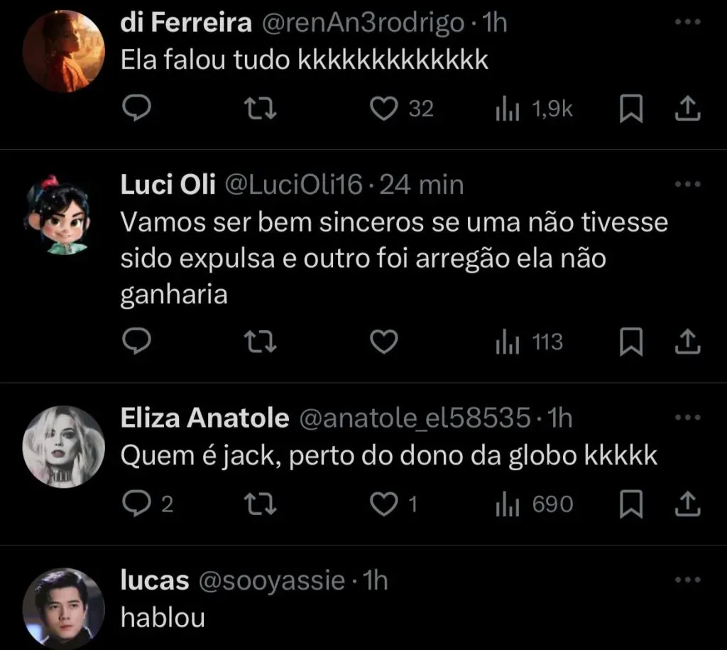 “Acho que é porque esse ano a Fazenda deu uma chicotada no outro reality e ele tá tentando ali se escalar! Bobo não é, né? Não vai confundir a cor do cabelo com a participante. Não colou o deboche, né, amigo”, mandou Jaque.