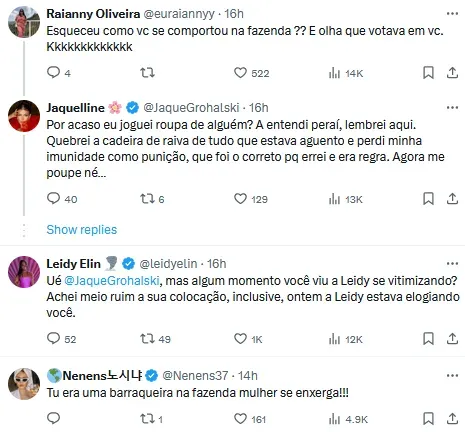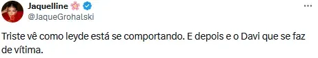 “Ué, Jaquelline Grohalski, mas algum momento você viu a Leidy se vitimizando? Achei meio ruim a sua colocação, inclusive, ontem a Leidy estava elogiando você”, escreveu a equipe.