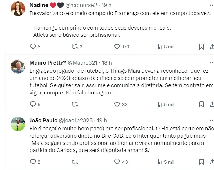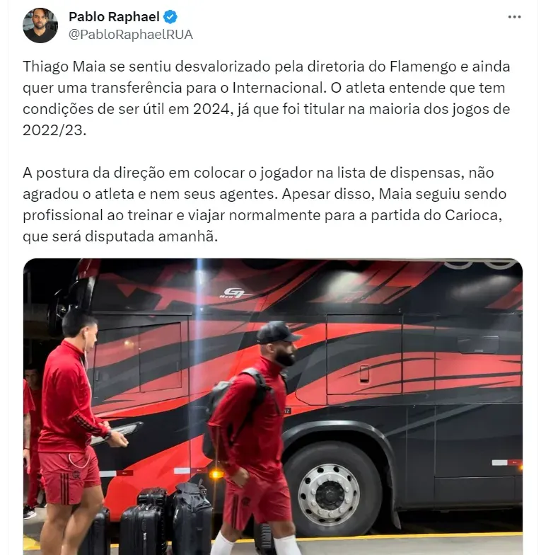 De acordo com Pablo Raphael, Thiago Maia se sente desvalorizado dentro do Flamengo e desesja sair do clube. O volante entende que tem qualidade de ser útil em 2024, já que foi titular em muitos jogos em 2023.