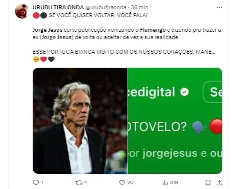 O vídeo, postado na quarta-feira (8), recebeu uma curtida de Jorge Jesus na postagem feita pelo Instagram. Essa interação do treinador português indica seu interesse e sua conexão contínua com o futebol brasileiro, mesmo atuando no exterior.
