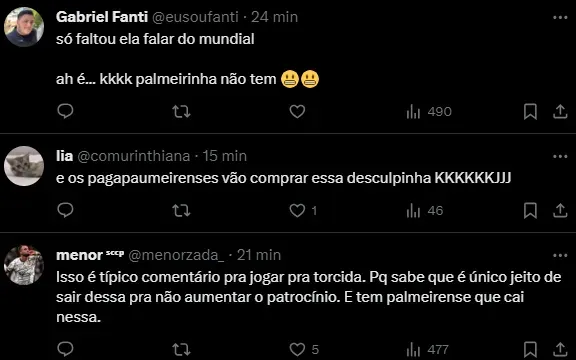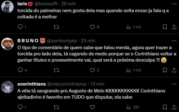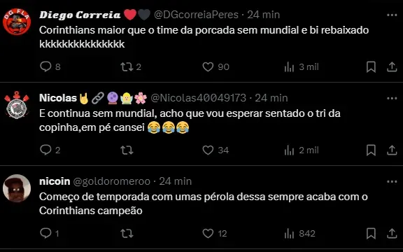 “Como esses clubes (Corinthians) não ganham nada em campo… vão só falar: ‘Eu tenho um patrocínio maior’. O que é isso? O que me interessa é o resultado em campo”, acrescentou.