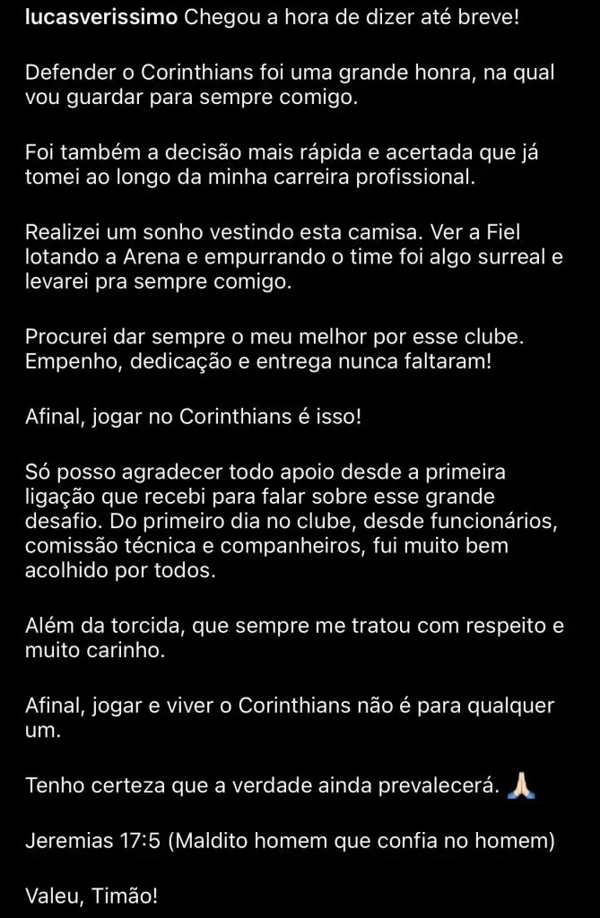 Neste sábado (27), o jogador quebrou o silêncio e publicou um texto de despedida nas redes sociais. No texto, Veríssimo diz a importância do Corinthians na sua carreira e mandou um ‘até breve’, que atiçou a Fiel.
