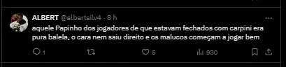 O jogador iniciou sua fala comentando sobre a saída do antigo treinador e relevando a chateação do grupo com a demissão de Carpini. “É uma vitória inegavelmente importante, conquistada em meio a uma semana turbulenta no centro de treinamento. Ficamos tristes com a saída do Carpini e queremos agradecê-lo”, disse o camisa 10.