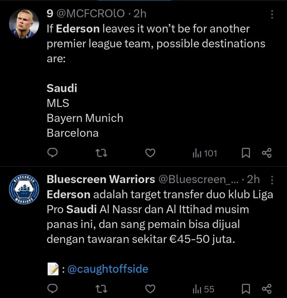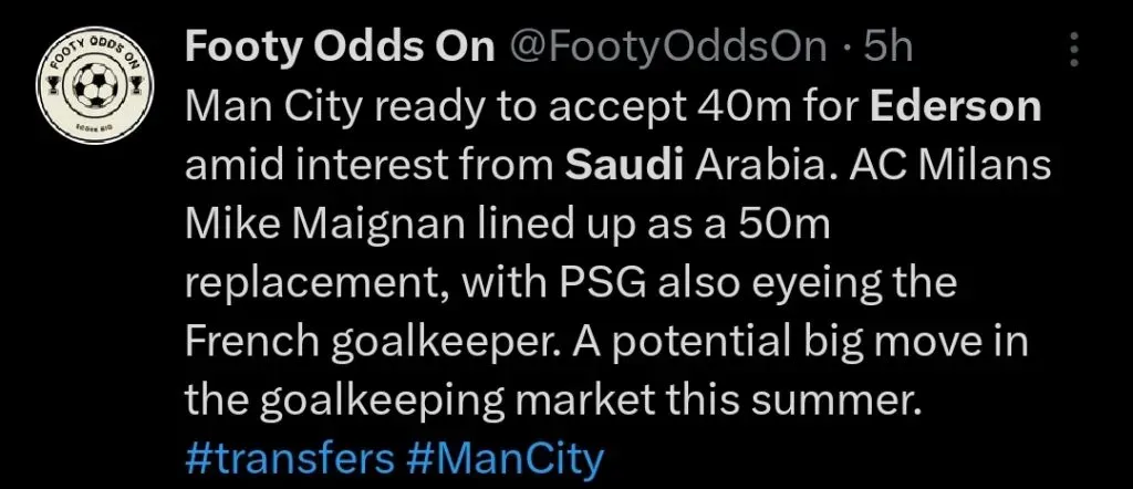 Neste cenário, o goleiro Ederson tem sido cotado para deixar o clube, com alguns times da Saudi Pro League já tendo manifestado interesse em sua compra. O principal deles, é o Al-Ittihad, que acaba de liberar Marcelo Grohe a custo zero.