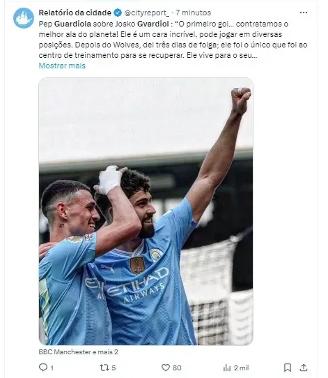 Após o jogo, em entrevista à BBC, Pep Guardiola elogiou a performance de Gvardiol, destacando sua capacidade técnica excepcional, especialmente sua habilidade com ambos os pés.