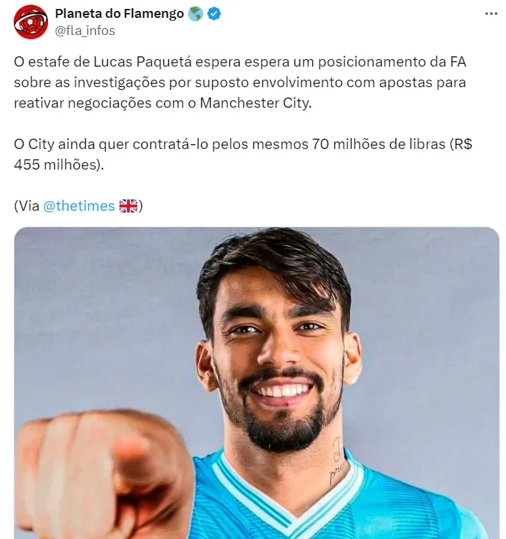 Com o sinal positivo de Lucas Paquetá, o Manchester City aguarda apenas o movimento da FA sobre as investigações por um suposto envolvimento com casa de apostas. Caso o jogador seja inocentado, as negociações tomarão conta perante ao West Ham.