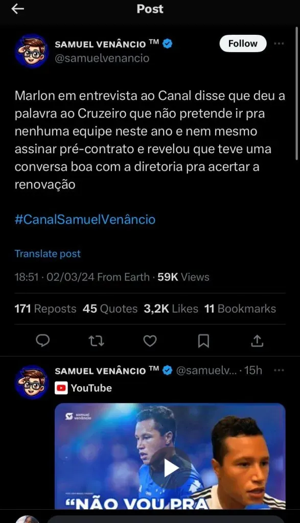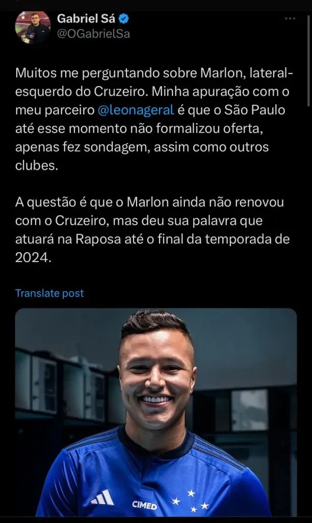 “Faço questão de externar isso aqui porque minha palavra é muito importante. Eu tenho um compromisso aqui no Cruzeiro. A gente espera renovar o contrato, as coisas estão muito bem encaminhadas, o Marlon está feliz no Cruzeiro”, disse ao canal do jornalista.