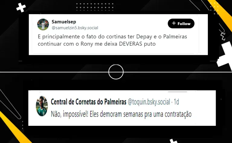 Ainda assim, houve quem deu uma cutucada na diretoria do Maior Campeão do Brasil: “Principalmente o fato do ‘Cortinas’ ter Depay e o Palmeiras continuar com o Rony me deixa deveras p***”, disse outro.