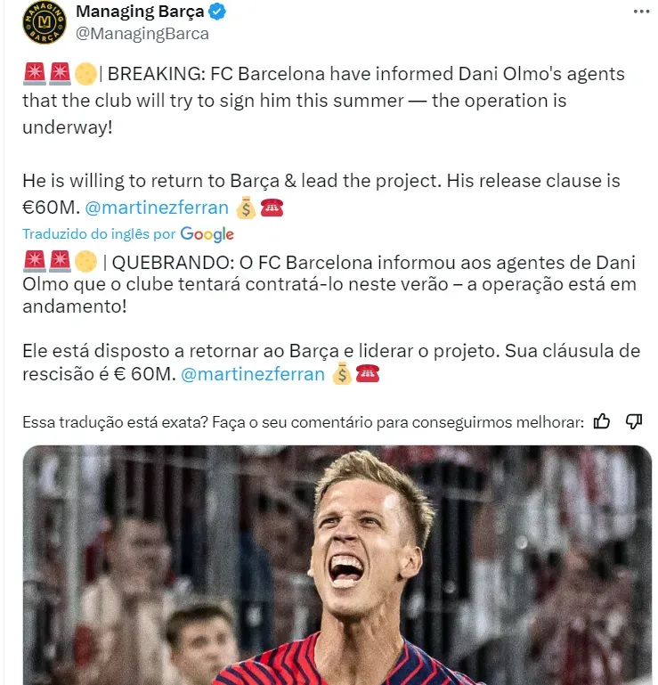 O Barcelona entende que Olmo tem um grande nível e deseja tê-lo no elenco na próxima temporada. Uma operação está sendo estudada pelo clube no momento. Todavia, os detalhes não foram revelados, avança o jornalista Ferran Martínez.