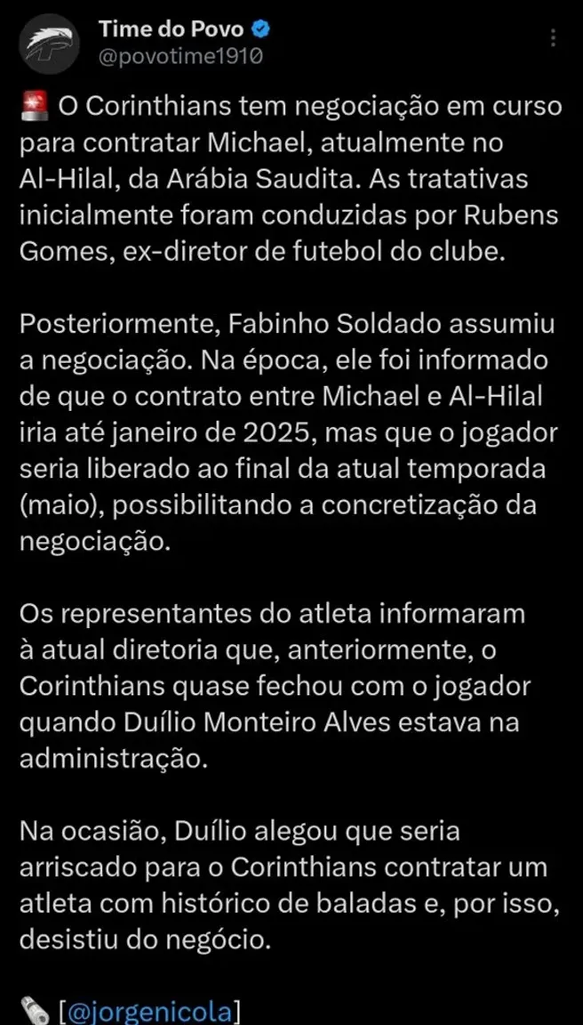 A fonte ainda afirma que as conversas têm acontecido desde o início do ano e foram iniciadas por Rubens Gomes, ex-diretor de futebol do Timão. Não obstante, mesmo sem Rubão, o negócio tem progredido com Fabinho.