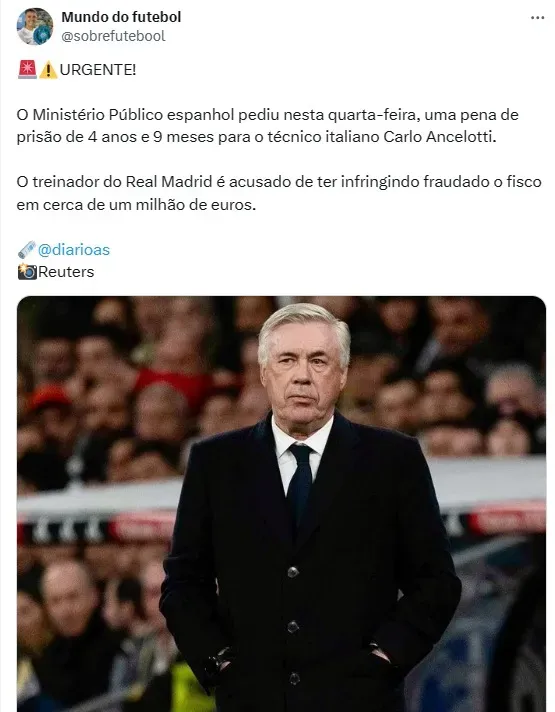 Carlo Ancelotti teria descoberto o pedido do Ministério Público da Espanha durante esta quarta-feira (6), enquanto está concentrado para o jogo de volta da Champions League entre Real Madrid e RG Leipzig.