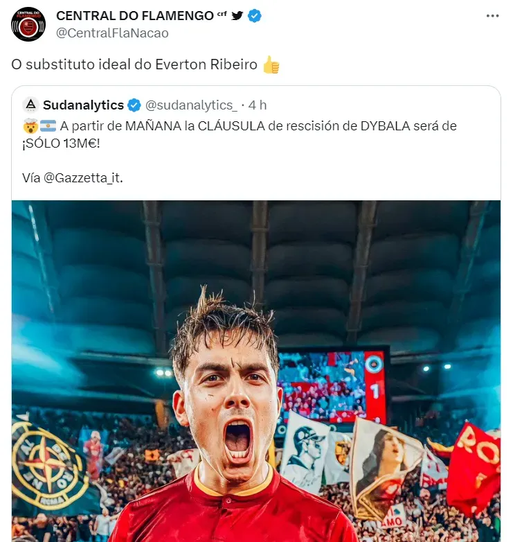 “O substituto ideal de Éverton Ribeiro”, diz um perfil voltado ao Flamengo sobre Dybala, sugerindo que o clube contrasse ao argentino para o lugar do camisa 7. Mas qual a chance?