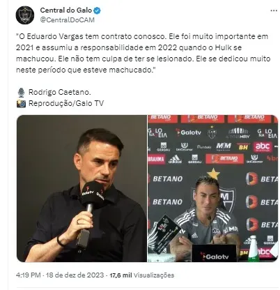 “As nossas discussões (diretoria) não eram e nunca foram absolutamente nada relacionado ao meu contrato, zero. Não houve nenhum tipo de barganha, o presidente pode comprovar. Foram mais discussões em relação à nossa estrutura de trabalho, de pessoas. Eu não vejo o Galo seguir sendo competitivo sem mantermos as condições que hoje temos”, disse.