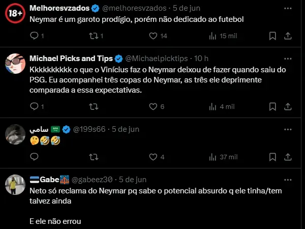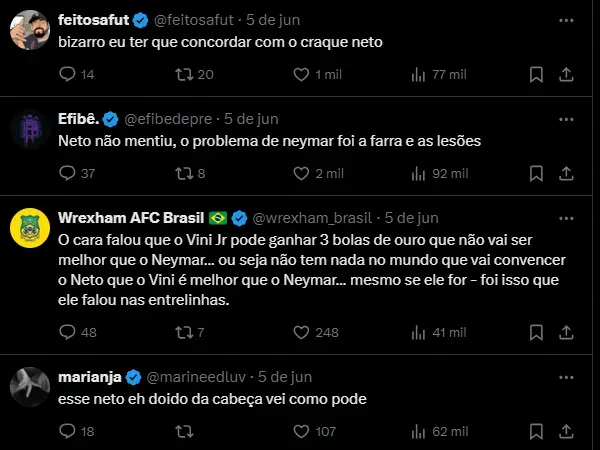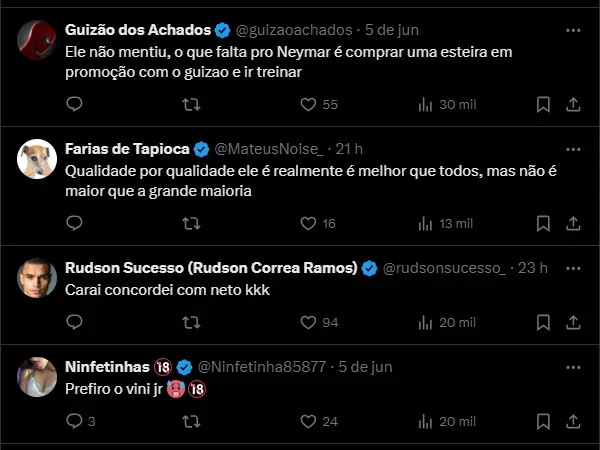 “O Vinicius Jr pode ganhar 3 Bolas de Ouro, mas ele não vai ser melhor que o Neymar nunca. Isso é o que penso. O Neymar é muito melhor que o Vinicius Júnior, Rodrygo, Mbappé, Cristiano Ronaldo”, destacou o comunicador.