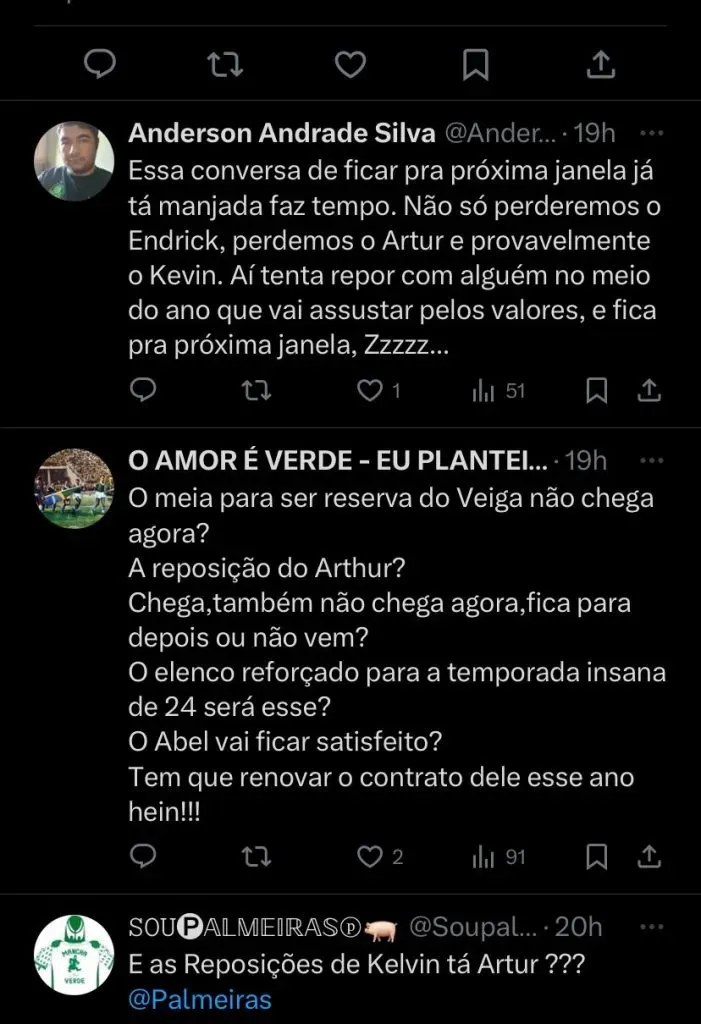 Lembrando que a janela de julho é movimentada na Europa, com isso, o Verdão terá mais opções para possíveis contratações vindas do Velho Continente. Porém, não há pressa alguma para definir essa situação.