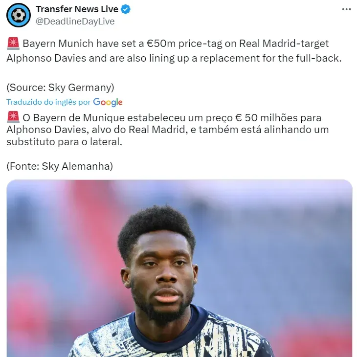 Espera-se que o clube merengue efetue a compra de Davies por 50 milhões. É um valor bastante alto para um jogador que está em fim de contrato, mas o atleta é visto como prioridade por Florentino.