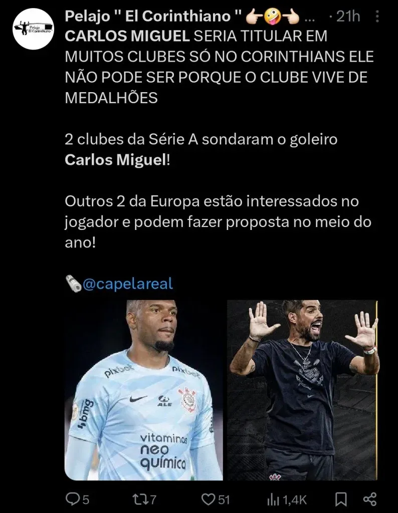 Carlos Miguel chegou ao Corinthians no fim de 2021 e, de lá para cá, vem chamando bastante atenção, tanto da Fiel, quanto dos rivais do futebol brasileiro.