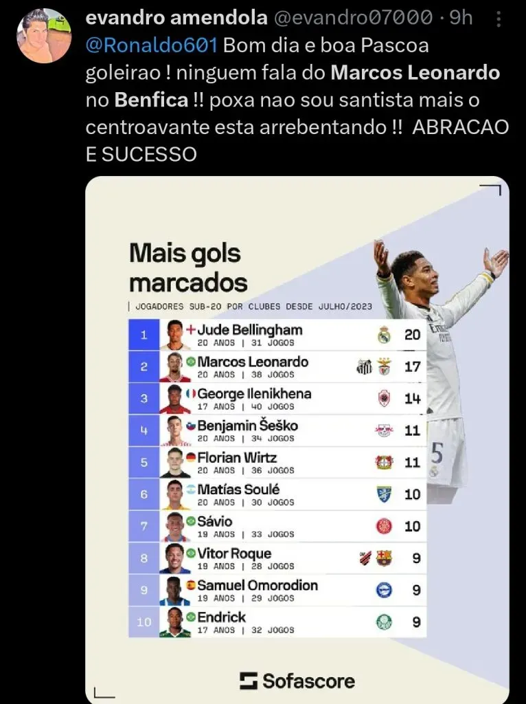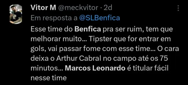 A própria torcida do Benfica não entende a falta de oportunidades para o garoto e, nas redes sociais, já cobra mais tempo para o atleta.
