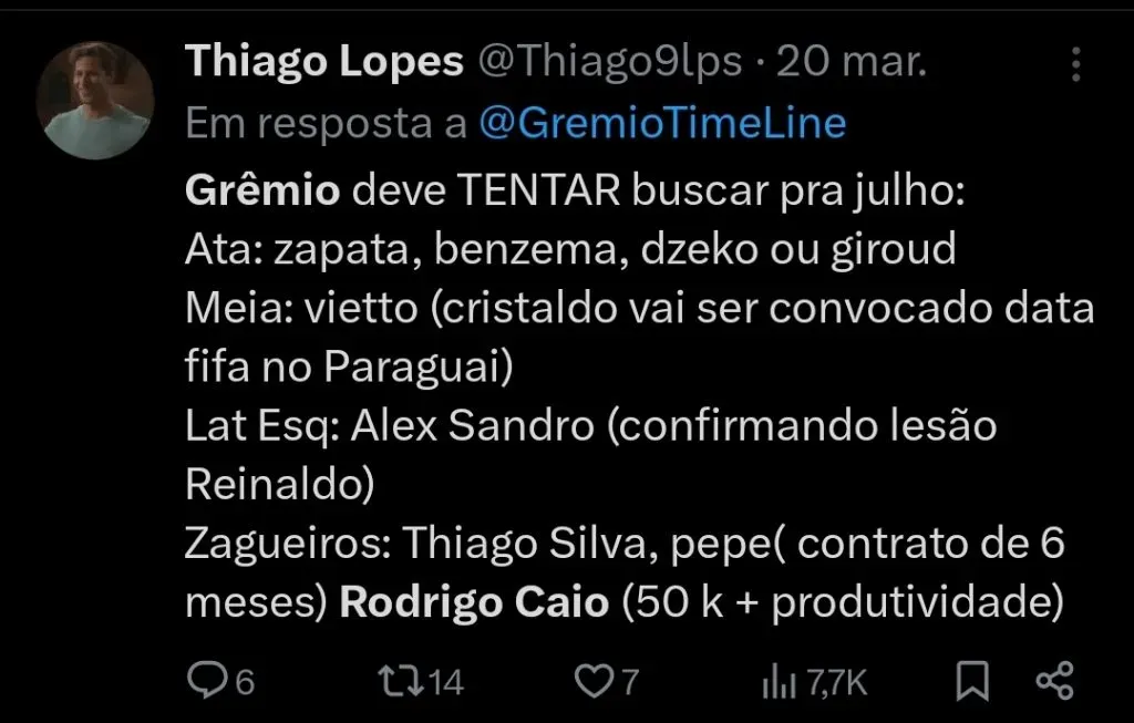 A equipe gaúcha, que até o momento trouxe bons nomes, sendo o principal deles Yeferson Soteldo, ainda considera que algumas posições de seu elenco carecem de reforços.