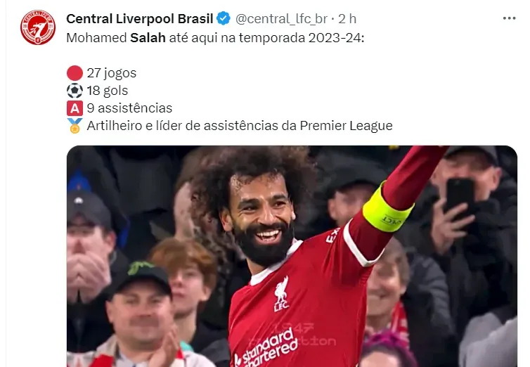 Em mais uma temporada fora da curva, aparece Mo Salah, do Liverpool, líder da Premier League. Atuando pela ponta, ele consegue ter números de um centroavante goleador. Inclusive, é o artilheiro da Premier League, com 14 gols, ao lado de Haaland, além de ser o maior assistente.