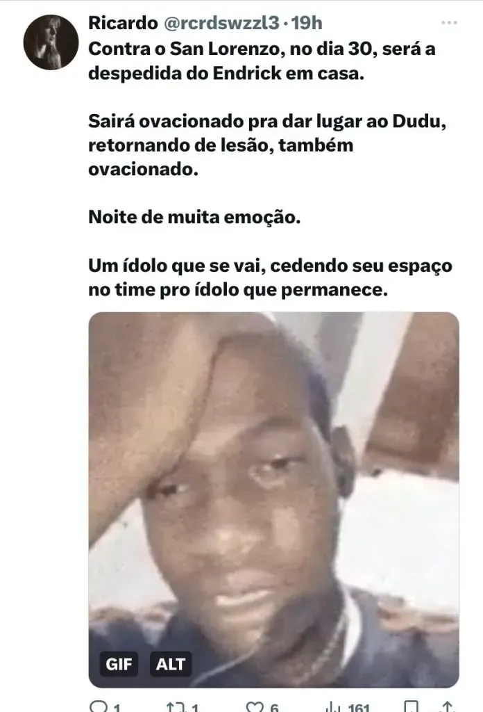 Diante disso, o Verdão já sabe que, diante da torcida, o último jogo de Endrick será no dia 30, contra o San Lorenzo, pela Libertadores, às 19h. A despedida oficial, antes dele partir para a Copa América, será contra o Atlético Mineiro, na Arena MRV, no dia 2 de junho.