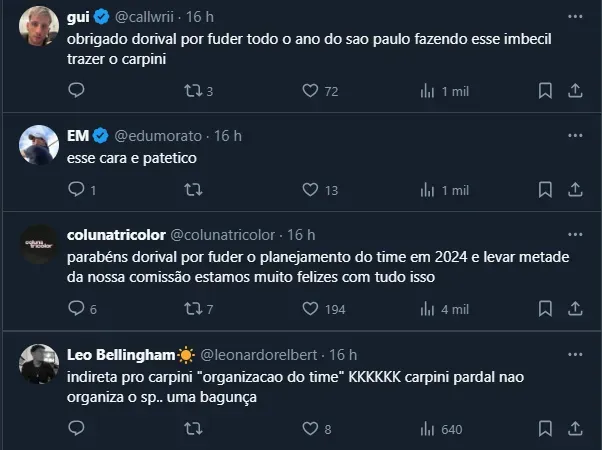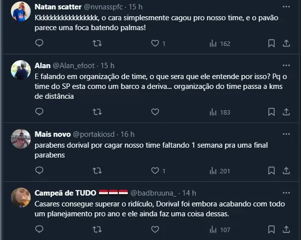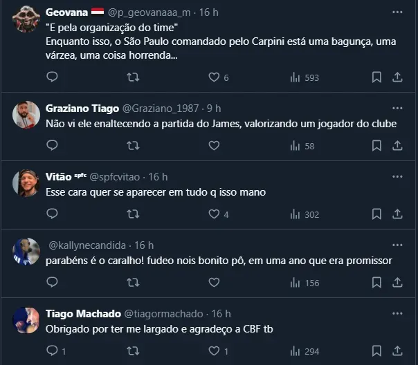 Diante disso, apesar da postagem de Julio Casares ter sido feita na intenção de parabenizar o atual técnico bicampeão da Copa do Brasil, a atitude não foi bem vista pela torcida, que viu como uma “alfinetada” em Carpini.
