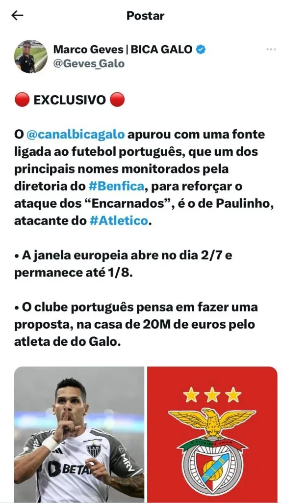 Benfica está de olho em Paulinho, para a próxima janela da Europa. Pelo menos é que informa o “Canal Bica Galo”, fonte de informação sobre o Clube Mineiro através da plataforma de vídeos, Youtube.